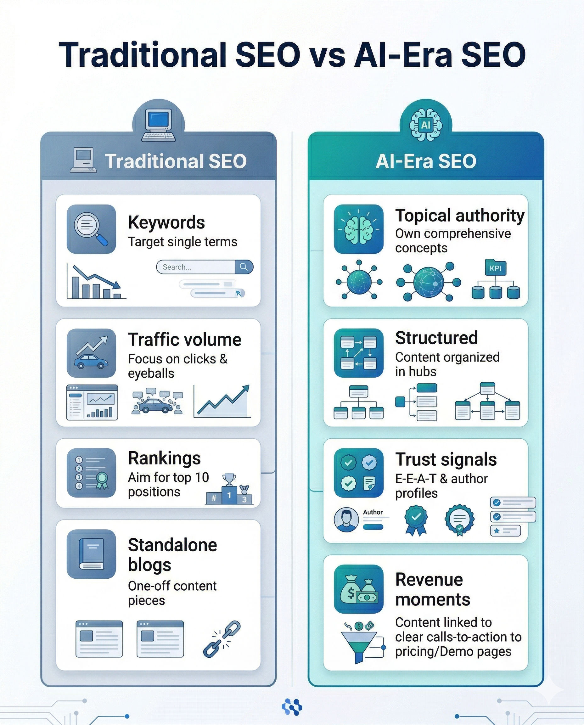 Content is often produced as standalone blog posts targeting broad keywords. There is little structure, little internal linking, and no clear ownership of a topic from start to finish.