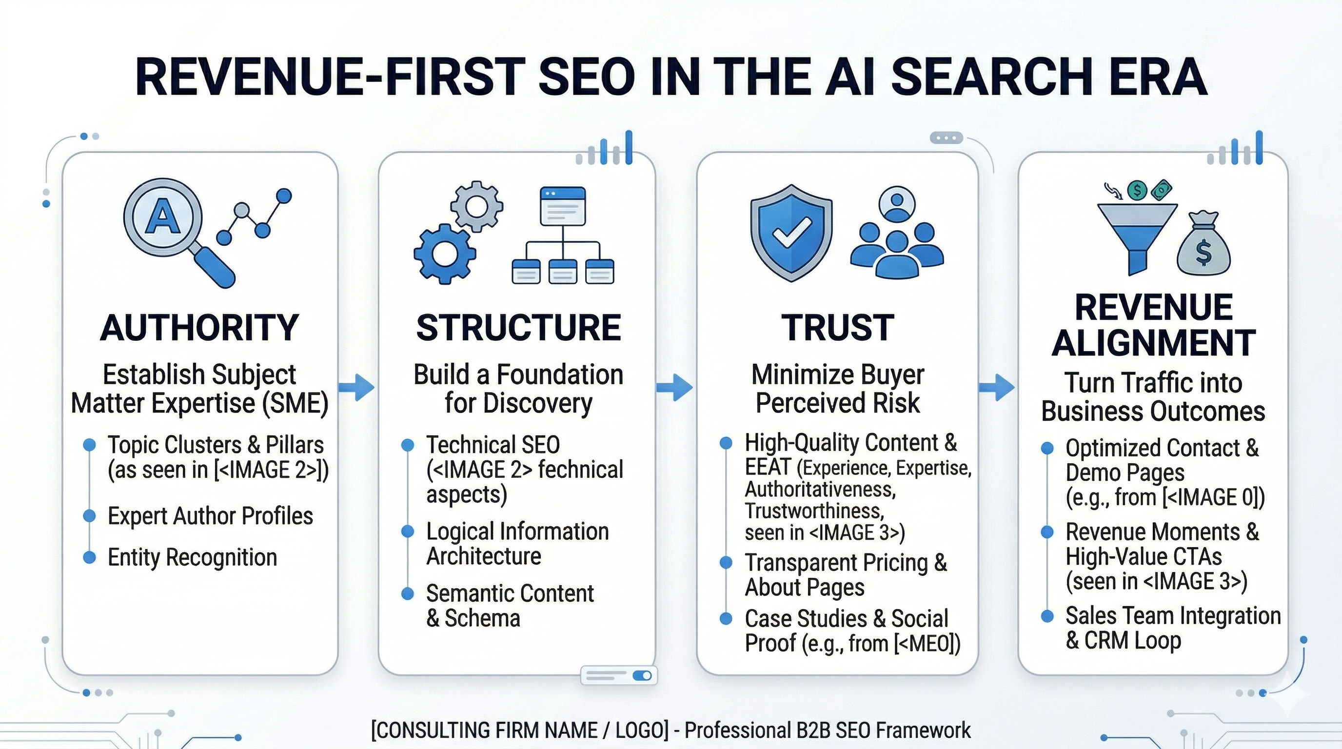 That audit would map organic content to pipeline, analyze how your brand appears in AI-driven experiences, identify a small number of strategic topic clusters, and align SEO with paid media and RevOps around the same intent signals.